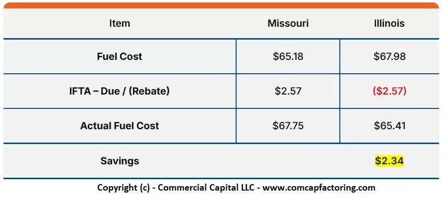 Below is a detailed comparison of this example. It shows a 100-mile trip, with 50 miles driven in Illinois and 50 miles driven in Missouri. In one case, the trucker buys the fuel in Illinois. In the other case, the trucker buys the fuel in Missouri.