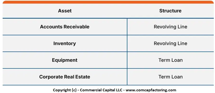 The structure of an asset-based loan depends on the collateral that secures the transaction. Lenders typically structure the facility as revolving lines or term loans. Transactions with mixed collateral usually offer both a revolving line and a term loan. The table below presents the typical structure for each asset type.
