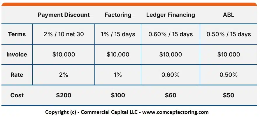 The following chart shows a cost comparison using early payment discounts, factoring, and asset-based lending. Each line is priced at the approximate level for their entry point pricing.